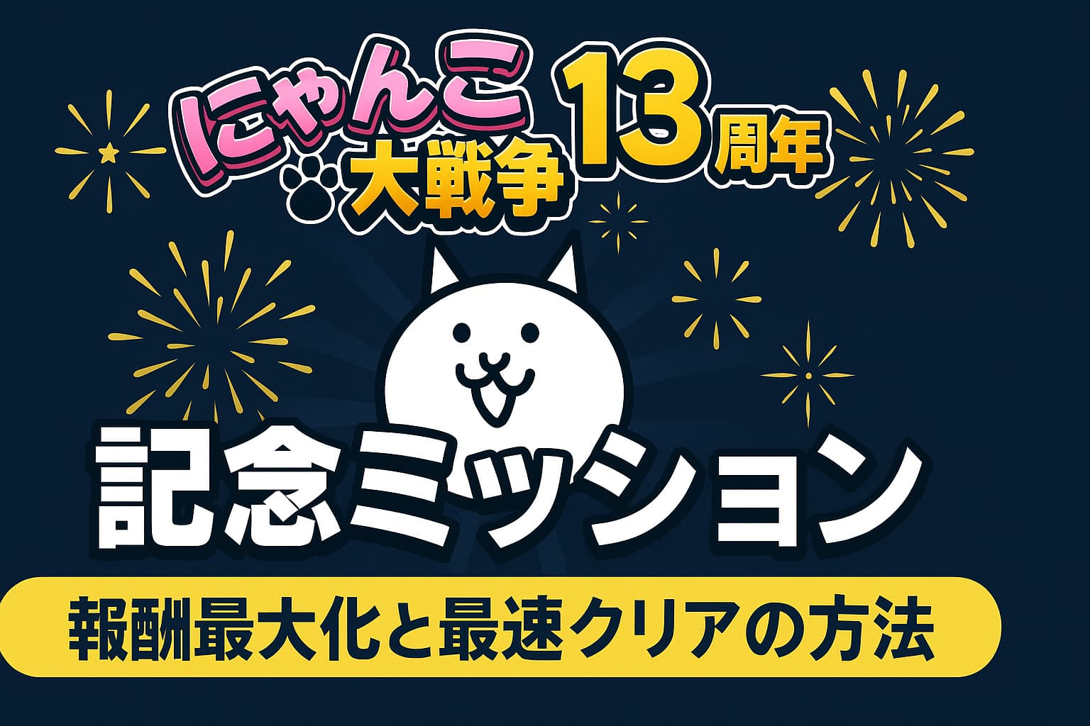この記事はにゃんこ大戦争13周年記念ミッションに備えるための“実戦ノート”。今わかっている事実(確定)とまだ発表されていない領域(未確定)、そして過去周年と運営の設計思想から導く予想をはっきり分けて整理します。嘘は書きません。わからないものは「わからない」と明記します。そのうえで、報酬の取り逃しゼロと最速クリアルートに直結する下ごしらえを、今日から始めましょう。